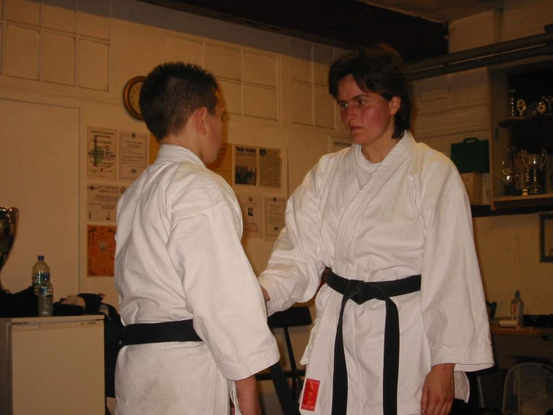 13:00 bis 14:30 durften die Kyu-Karatekas nochmals am profunden Fundus Sensei Derek Ridgways teilhaben. Diesmal war es die Kata Heian Nidan, um deren Anwendung es gehen sollte! Auch Petra nahm (zusätzlich zu ihren eigenen Trainingseinheiten!) teil und war als Danträgerin selbstverständlich des Senseis Vorführpartnerin für die Demonstration der Anwendungen. Der Aufbau des Trainings entsprach dem gestrigen, nur das die hier gezeigten Anwendungen der Heian Nr. 2 komplexer wirkten, ein höheres Maß an konzentrierter Wahrnehmung und Umsetzung erforderten, als die der Heian Shodan. Ganz zum Schluss ertönte des Senseis Aufforderung, nun noch einmal und möglichst flüssig die ganze, gestern erlernte Anwendung von Heian 1 zu versuchen. Obwohl, so stellte Jean z.B. hinterher fest, er die Abläufe mehrfach (mental und real) durchgegangen war und sich ihrer vor diesem Training noch sicher wähnte, hatte er größte Mühe, sie in diesem Moment, in dieser Situation (erschöpft und soeben voll mit Heian 2-Anwendungen beschäftigt) abzurufen und umzusetzen.