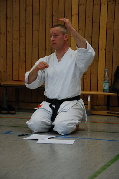 Sensei Nico Ibscher, der den Kurs leitete, gab sowohl eine theoretische wie auch praktische Zusammenfassung der bisher auch unter seiner Leitung stattgefundenen 3 Modulen. Insbesondere in der zweiten Trainingseinheit am Samstag wurde besonderen Wert auf das karatespezifische Training, wie Schnellkraft und Ausdauertraining, gelegt.